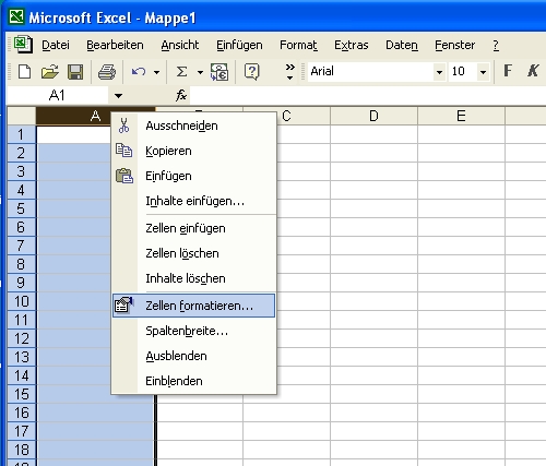 | Um die Handynummer im korrekten Format anzuzeigen muss die Handynummer-Spalte so formatiert werden, dass Excel die Zeilen als Text darstellt. Dadurch wird die 0 am Anfang jeder Handynummer nicht abgetrennt. Wie Sie eine Spalte in Excel formatieren, wird Ihnen im Folgenden erklärt: Klicken Sie mit der rechten Maustaste auf den Spaltenkopf der Spalte, in der Sie die Handynummern speichern wollen. Wählen Sie nun "Zellen formatieren" aus: |
