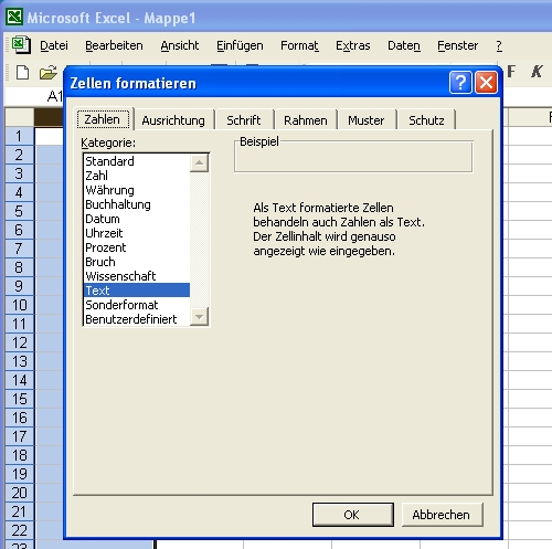 | In dem Reiter "Zahlen" klicken Sie dann auf "Text". Jetzt wird in jeder Zeile dieser Spalte die Eingabe als Text gespeichert: |