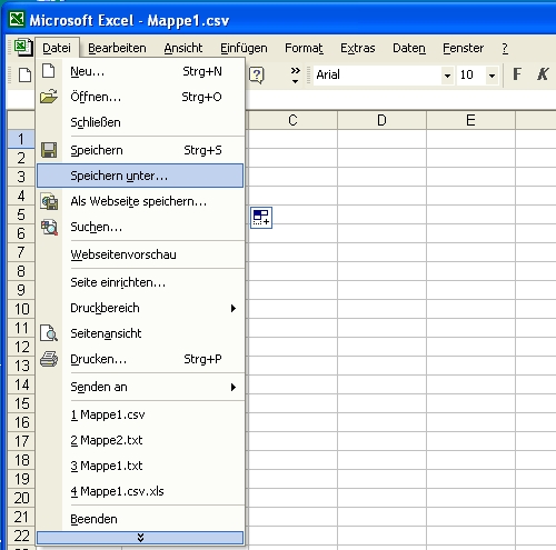 | Um die Liste mit den Handynummern nun im richtigen Format abzuspeichern gehen Sie wie folgt vor: Klicken Sie auf "Speichern unter..." |