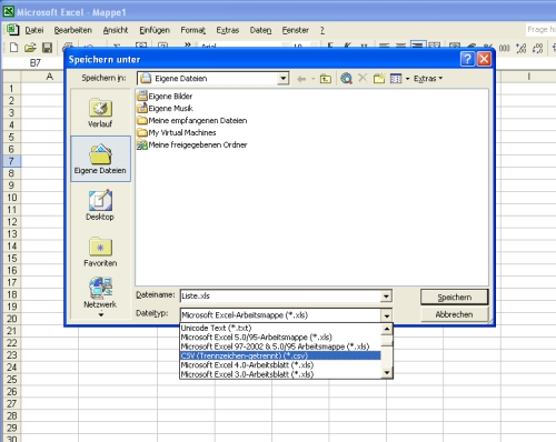 | Zunächst können Sie Ihrer Liste einen Namen geben (z.B. "Liste"). Dann sollten Sie als Dateityp "*.csv" auswählen. Jetzt ist die Datei in dem Verzeichnis, dass sie ausgewählt haben als Datei gespeichert, die Sie bequem hochladen können, um Massen SMS zu versenden. |